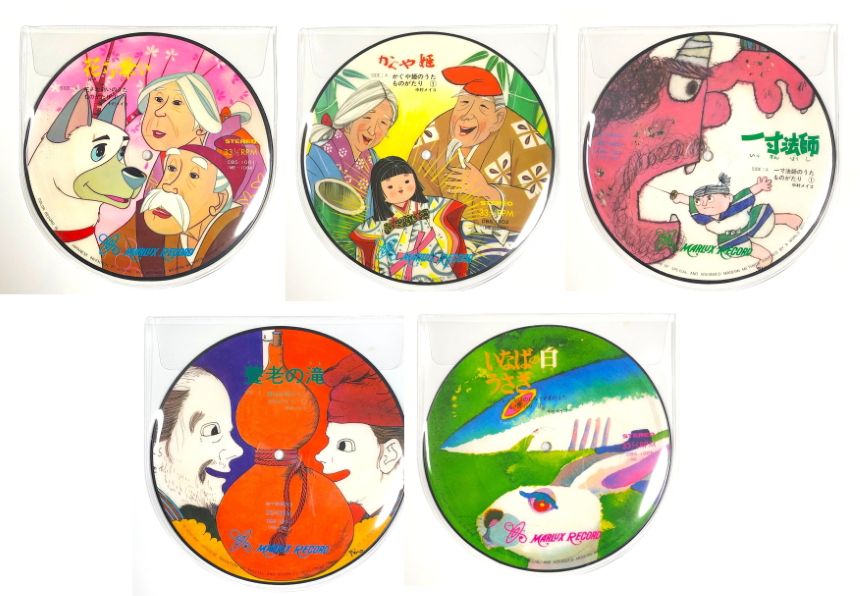<Marlux Record 日本むかしばなしシリーズ> (DBS-1001~1005)は、1970年前後に「マーレックスレコード(Marlux Record)」が制作した、 日本製ピクチャー盤の代表作です。 透明PVCで挟み込む“三層サンドイッチ構造”は、 当時日本の数社だけが保有していた特許技術で、外周にはその証として “COLOR RECORD IS GENUINE JAPANESE INVENTION OF SPECIAL AND ADVANCED MODERN METHODS…” という表記が全5枚に刻まれています。 ![]() 語りと歌は、中村メイコ。 当時の童話レコードとしては、とてみ贅沢なキャスティングで、 音楽性・演出ともに教材レコードの中では突出した内容を持っています。 5作品は、「いずれも基本の日本むかしばなし」で構成され、 DBS-1001 ~ 1005の連番で完結する極めて珍しい「全5枚セットシリーズです。 現在では市場流通が極端に少なく、 まとまった形で現存する例はほぼ確認されていません。 PicVinyl.jp では、本シリーズを「教育用ピクチャー盤史における重要資料」と位置づけ、 作品詳細とともにアーカイブとして紹介します。 シリーズリスト(全5作品)